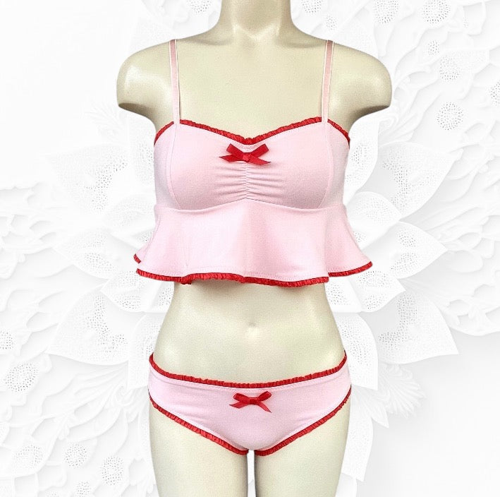 Pink bamboo chemise with red frill elastic, red satin bow & convertible (criss cross-able) straps.