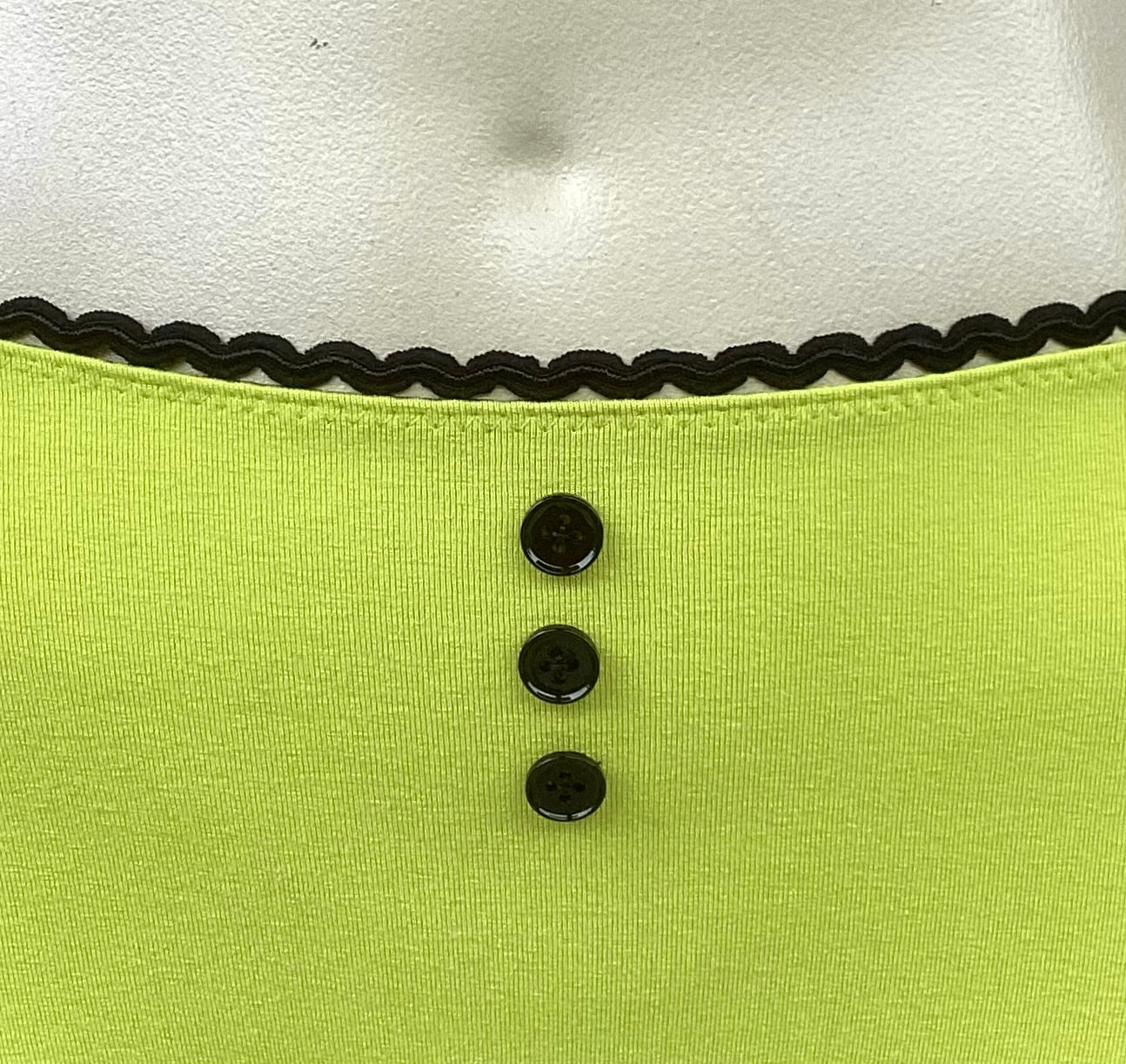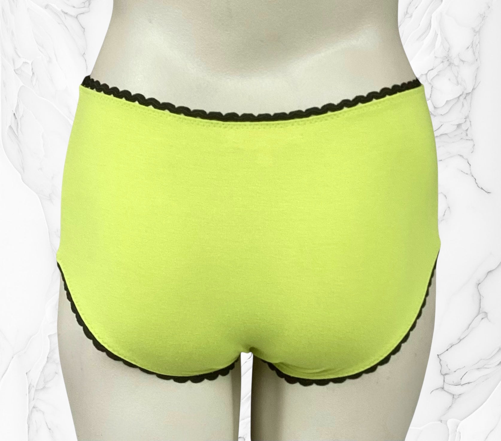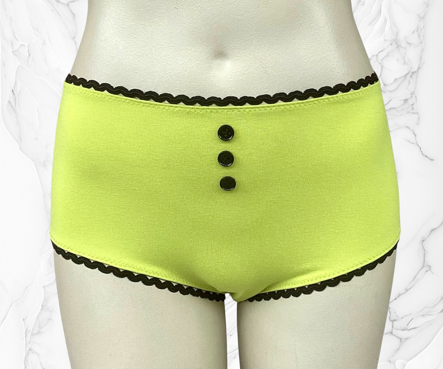 Chartreuse viscose high waist panties with black ric-rac elastic & black buttons.