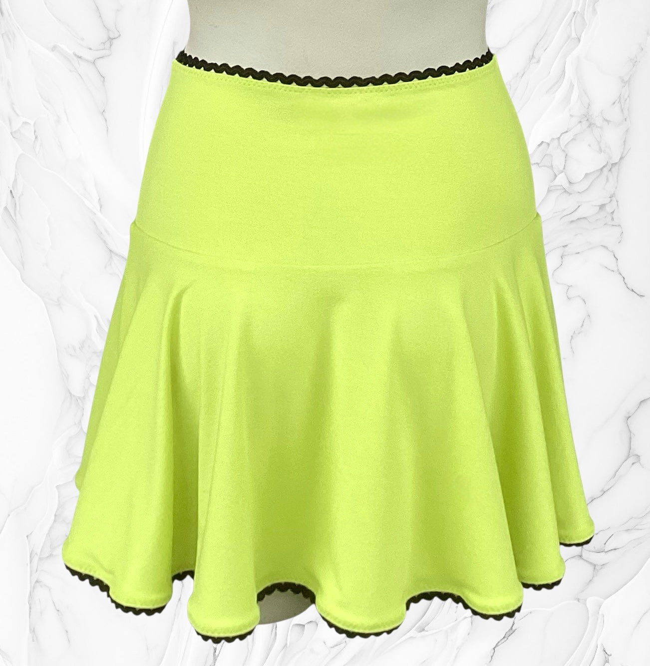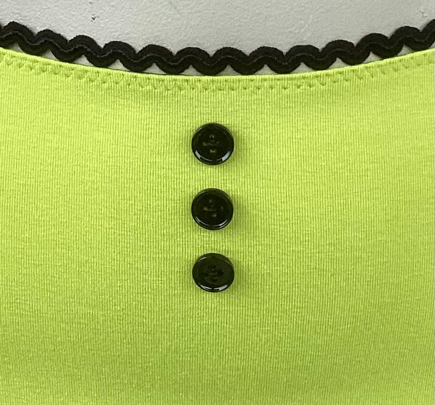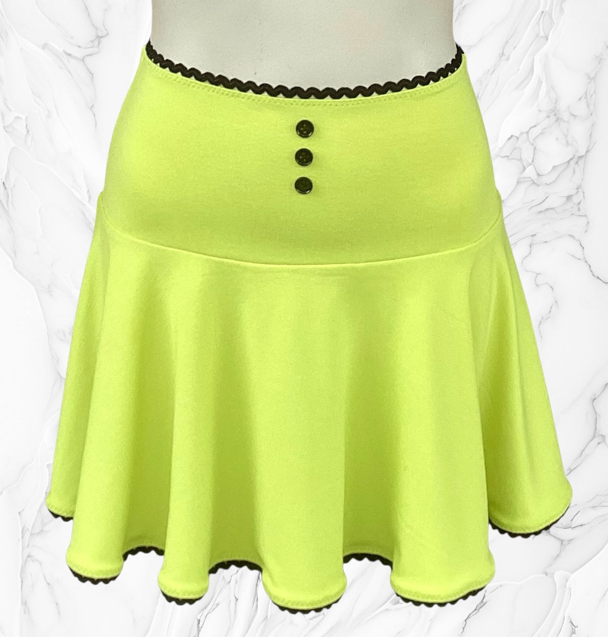 Chartreuse viscose skirt with black ric-rac elastic & black buttons.