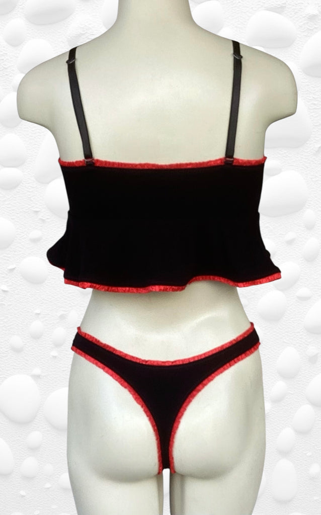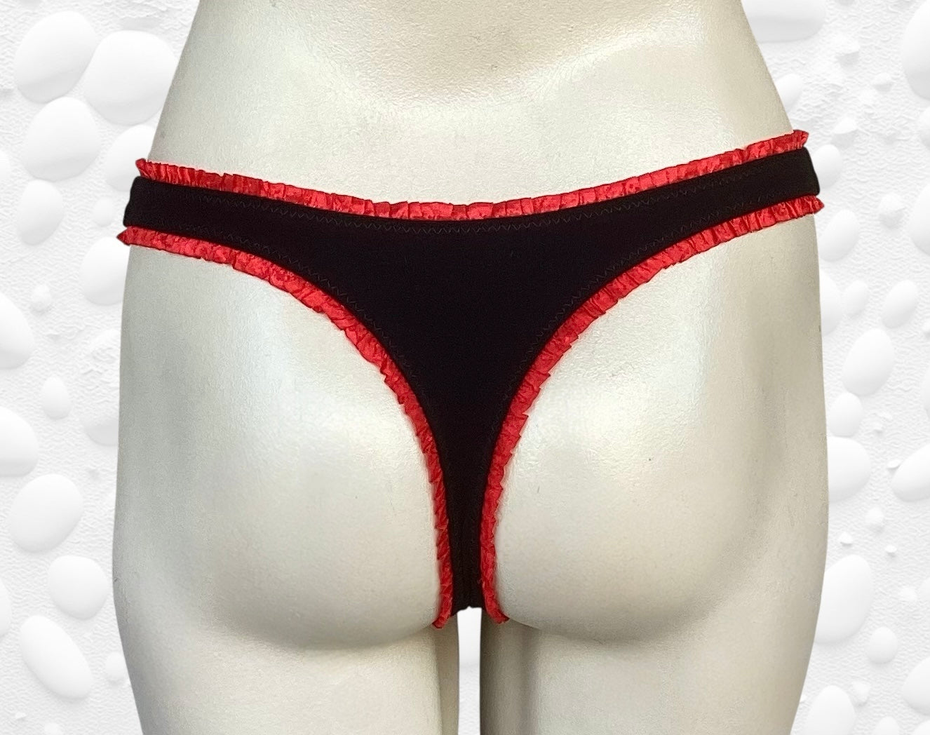 Black thong bamboo panties with red opaque red frill elastic & red satin bow.