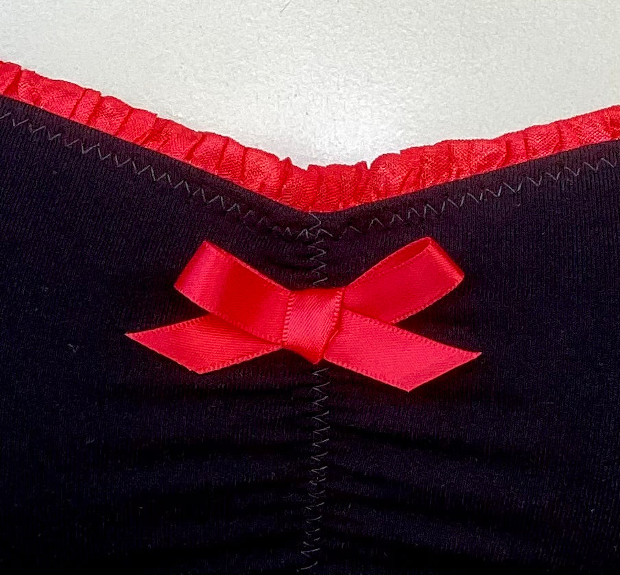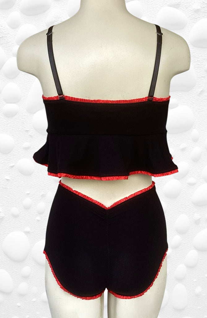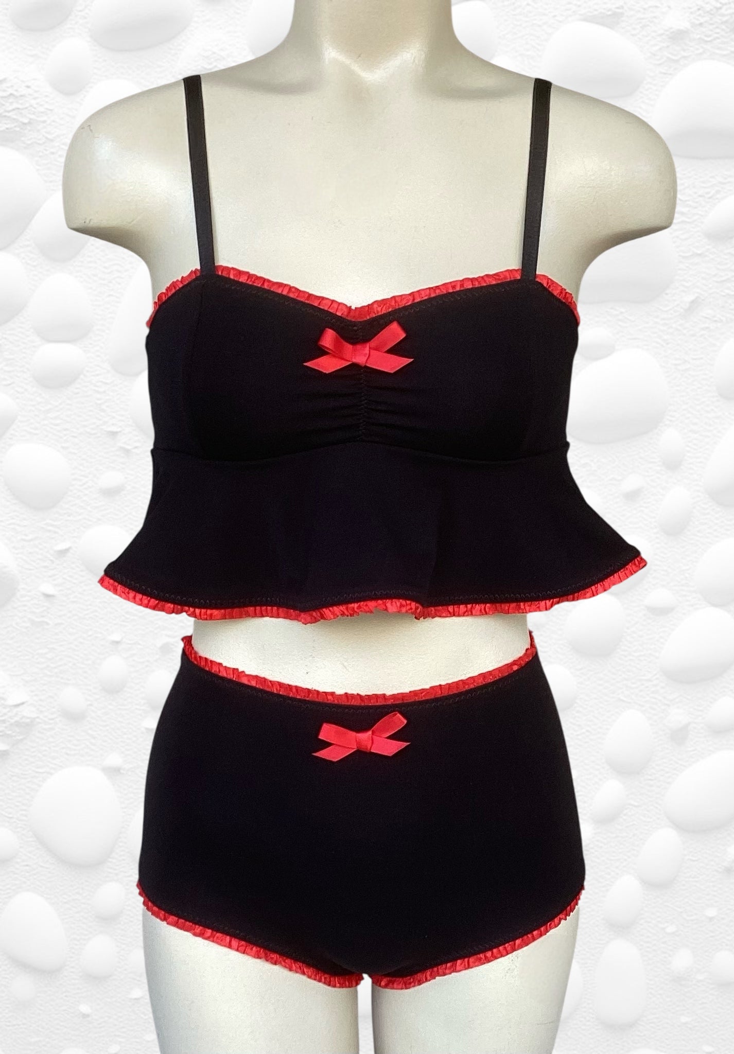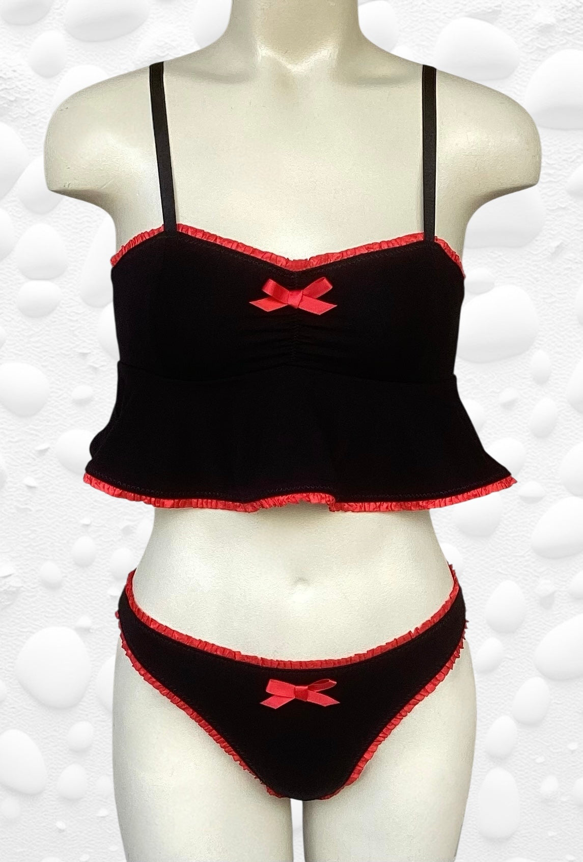 Black bamboo bralette with peplum, opaque red ruffle elastic, red satin bow & convertible (criss cross-able) straps