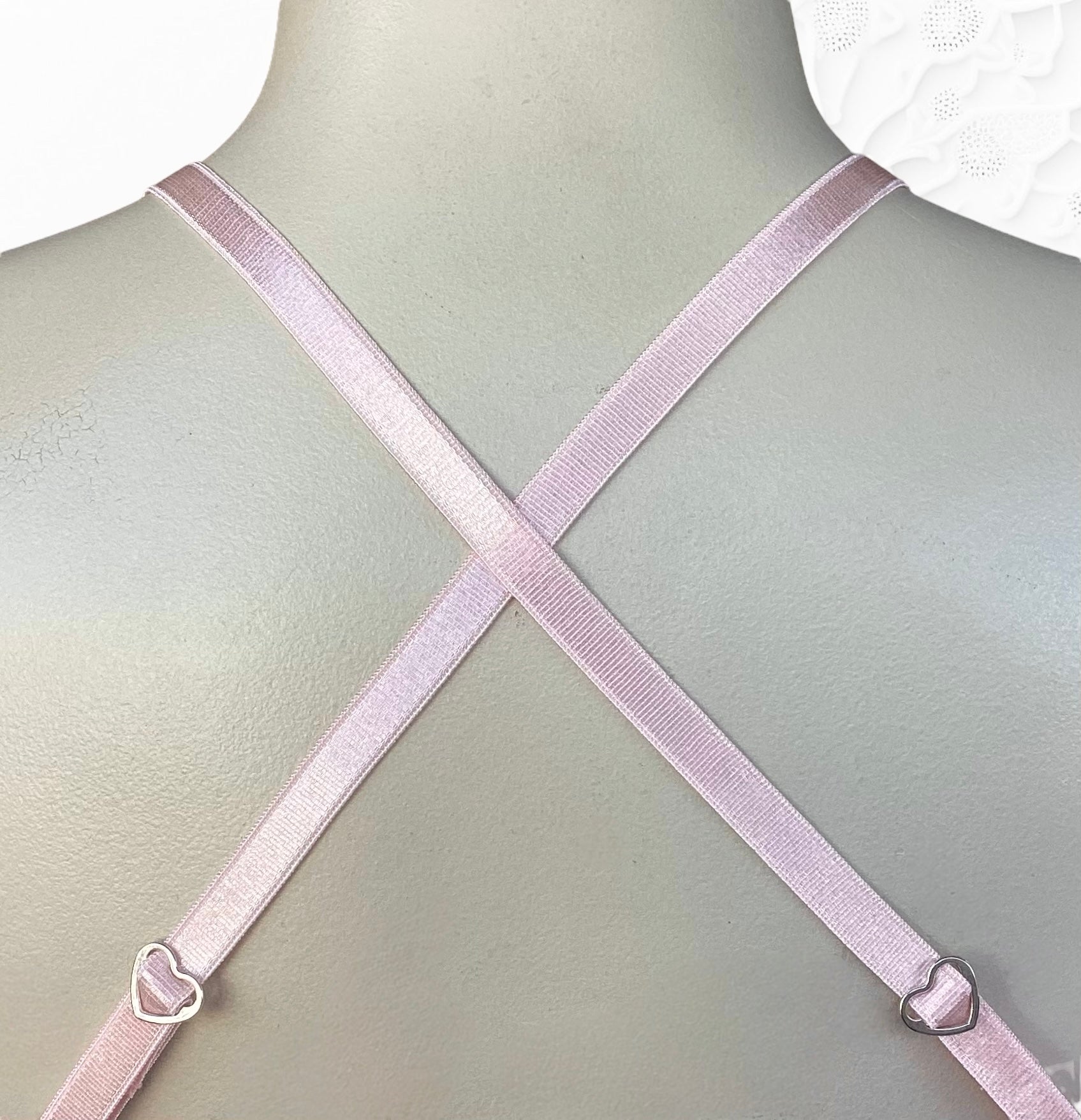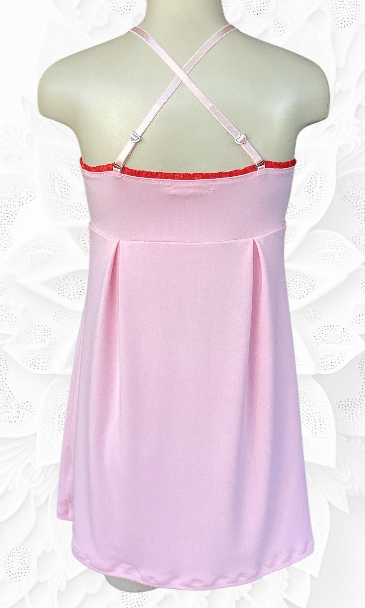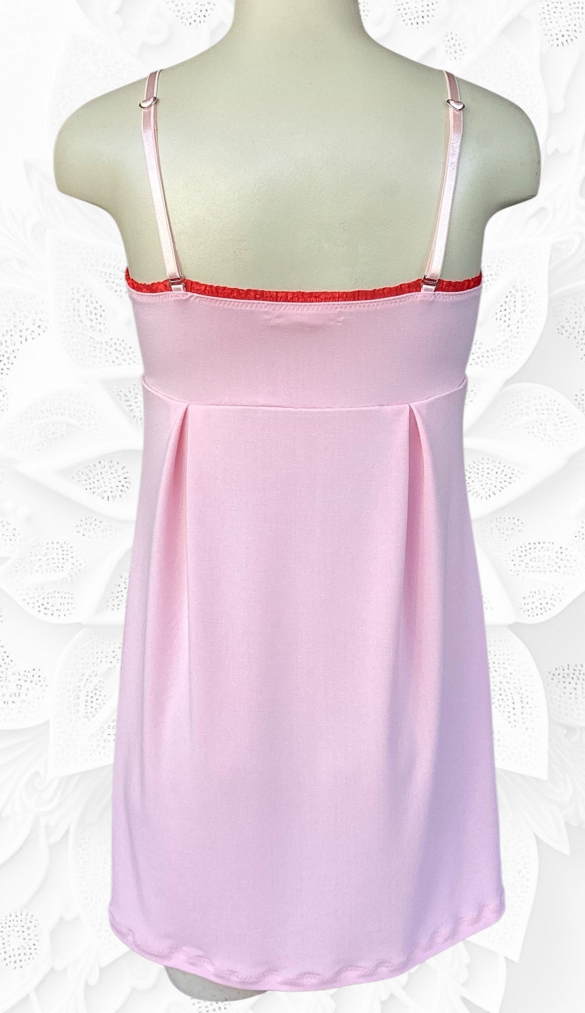 Pink bamboo chemise with red frill elastic, red satin bow & convertible (criss cross-able) straps.